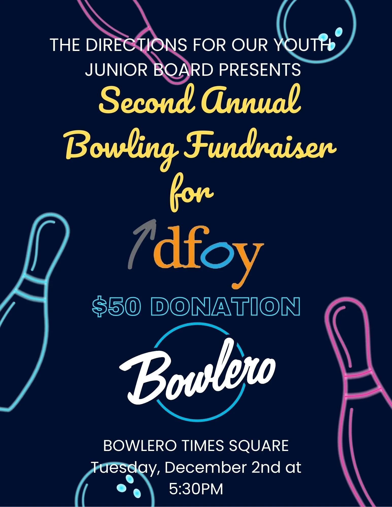 The DFOY Junior Board is excited to celebrate Giving Tuesday with a special community event—our Second Annual Bowling Fundraiser! On Tuesday, December 2nd, we’re bringing supporters together at Bowlero Times Square to have fun, raise funds, and uplift the young people we proudly serve across the Bronx and Manhattan.